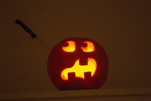 Halloween Kürbis mit Messer im Kopf
